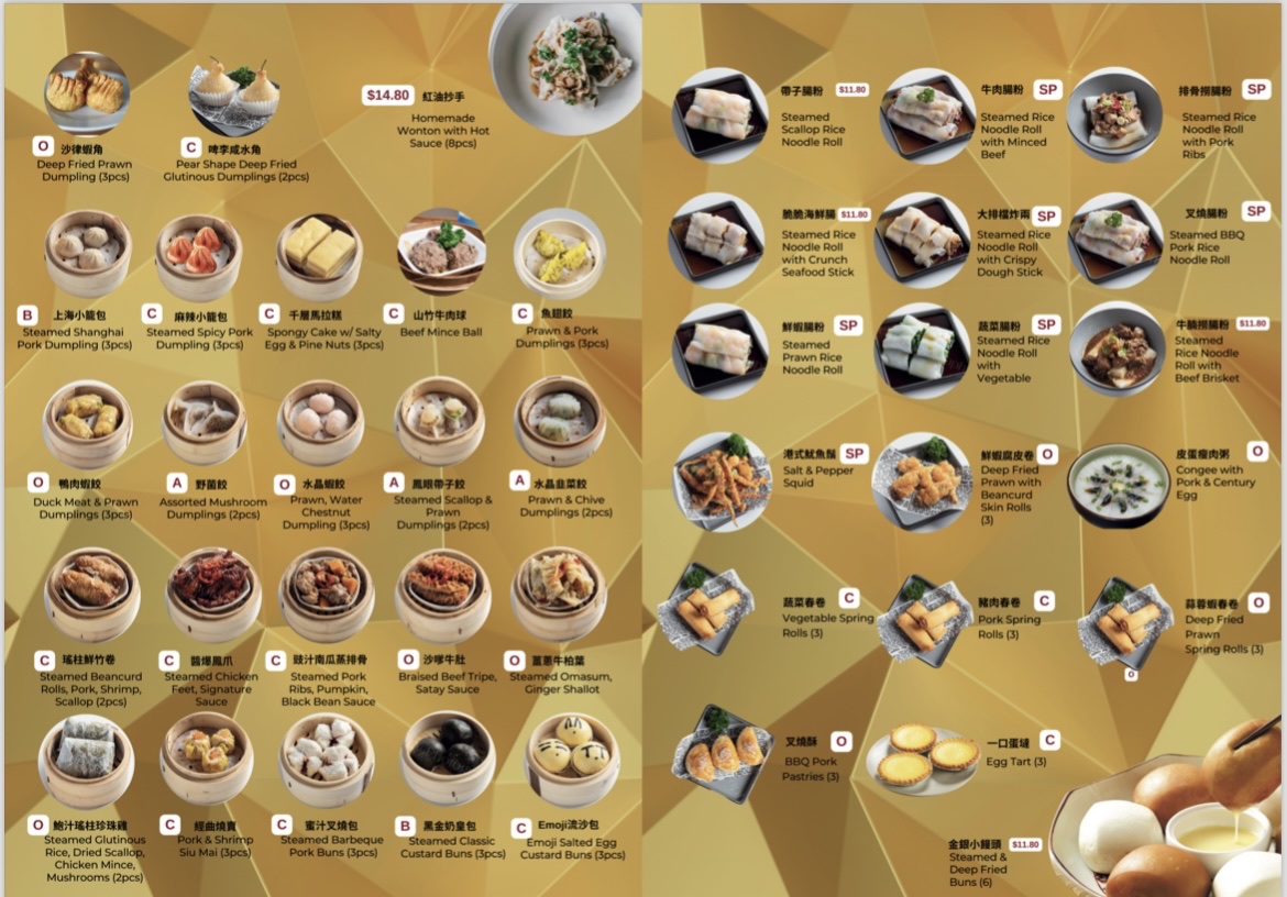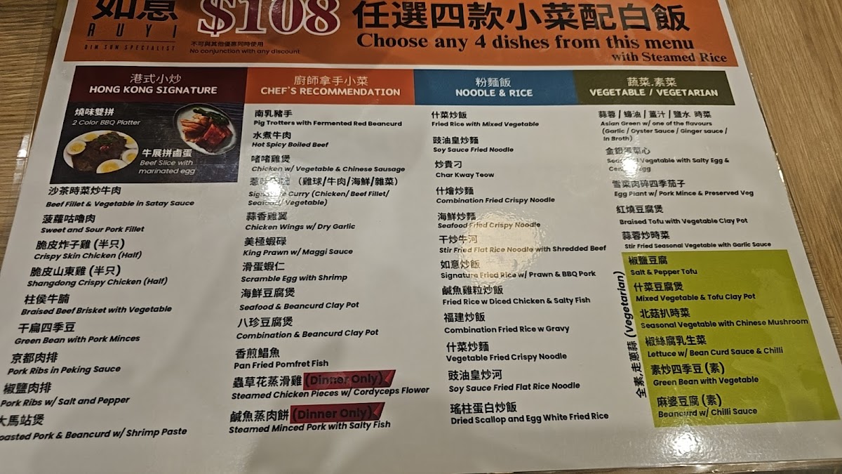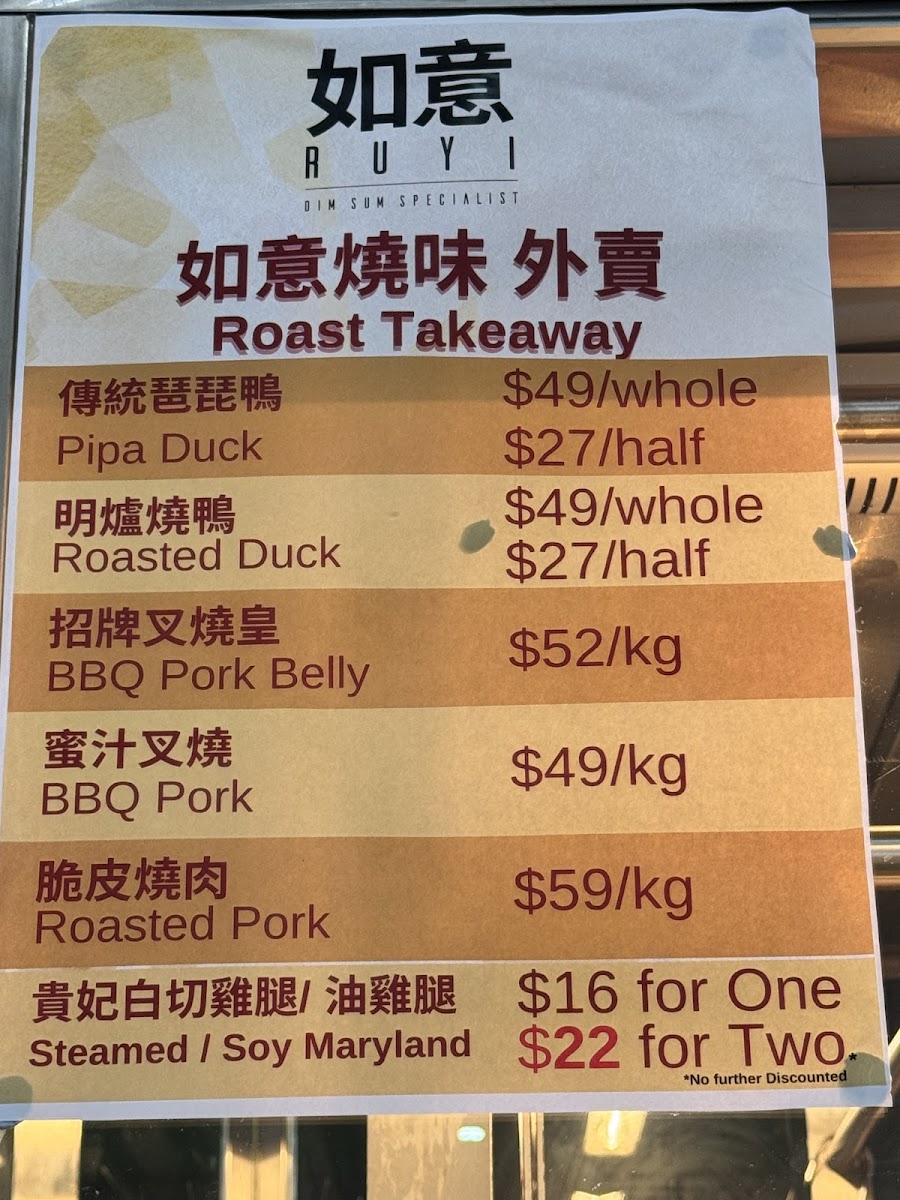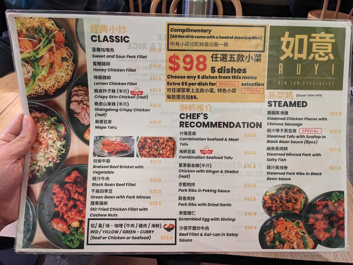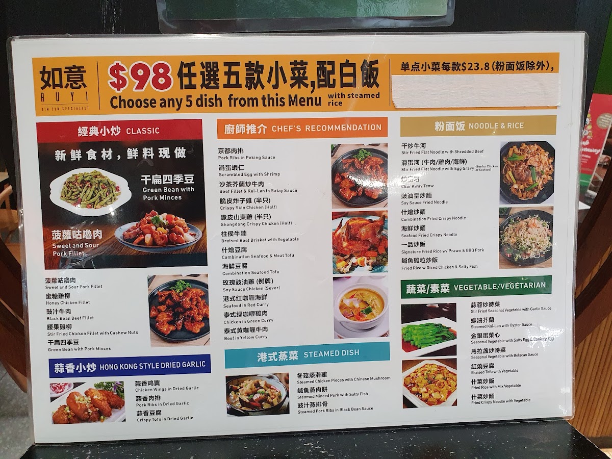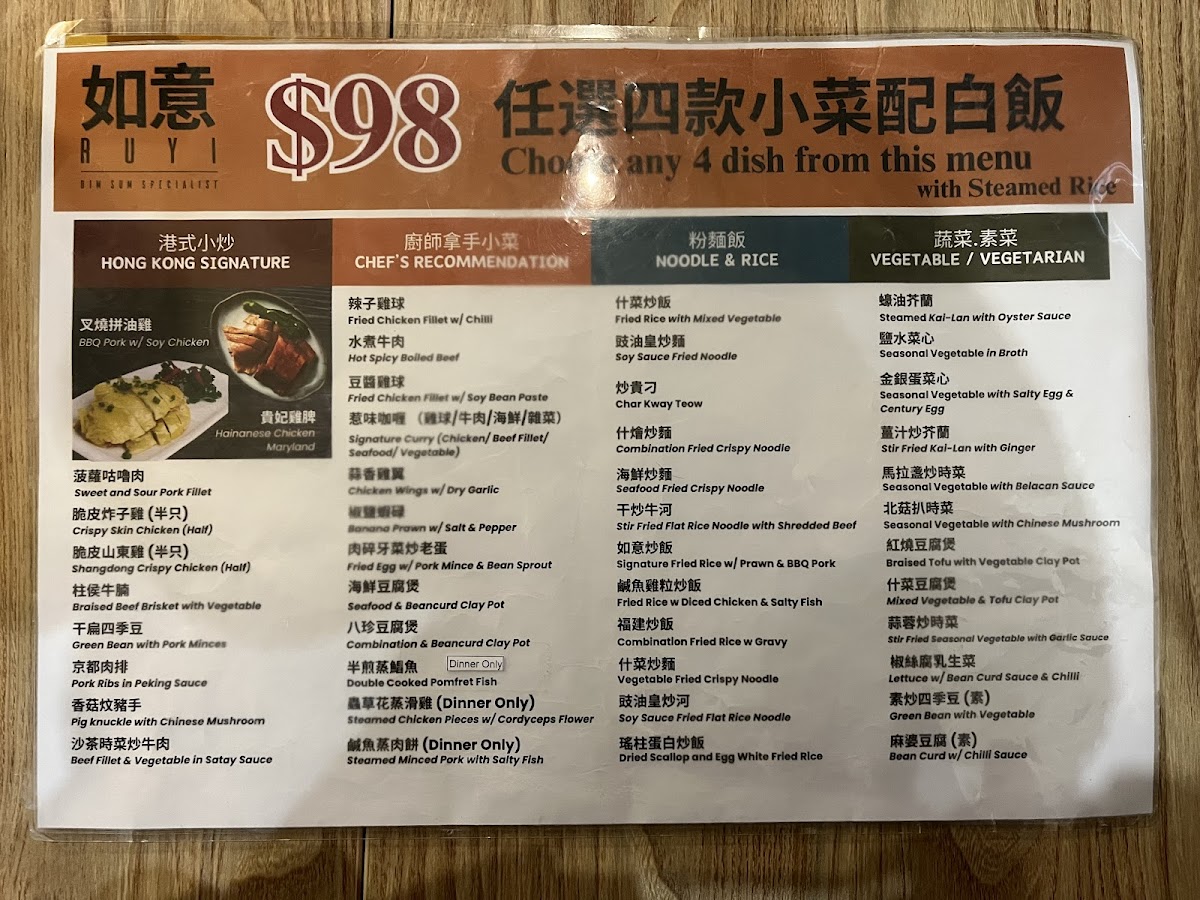 From a reviewer’s perspective, the menu at Ru Yi Dim Sum offers a wide and satisfying range of dishes that showcase both traditional dim sum and hearty Cantonese-style meals, with highlights from the chef’s recommendation such as Beef Fillet & Kai-Lanin Satay Sauce, Crispy Skin Chicken (Half), Shangdong Crispy Chicken (Half), and Braised Beef Brisket With Vegetable. The lunch specials are especially appealing, featuring comforting options like Congee With Pork & Century Egg, Steamed Scallop Rice Noodle Roll, and Steamed Rice With Chicken Feet & Pork Ribs, while convenient combinations such as the single set meals with E-Fu Noodle + Iced Lemon Tea or Special Fried Rice + Iced Lemon Tea provide good value. The dim sum selection is varied, including QQ Mini Chinese Sausage Buns, Steamed Sticky Rice, and Homemade Wonton With Hot Sauce, alongside popular rice noodle rolls like Steamed BBQ Pork Rice Noodle Roll and Steamed Prawn Rice Noodle Roll. For roast and braised specialties, dishes like Signature Pipa Duck (Half), Roasted Pork, and BBQ Pork stand out, while stir-fried favorites such as Kong Po Chicken, Beef Cube With Black Pepper, and Chicken With Cashew Nut offer familiar flavors. Seafood lovers can enjoy items like Jumbo Prawn With E-Fu Noodle, Soft Shell Crab In Singapore Style, and Steamed Jumbo Oyster, and there is no shortage of vegetable dishes such as Mapo Tofu and Steamed Kai-Lan With Oyster Sauce. To finish, classic desserts like Sesame Balls, Egg Tart, and Mango Pudding round out a menu that feels extensive, well-balanced, and suitable for both casual dim sum dining and larger group meals.